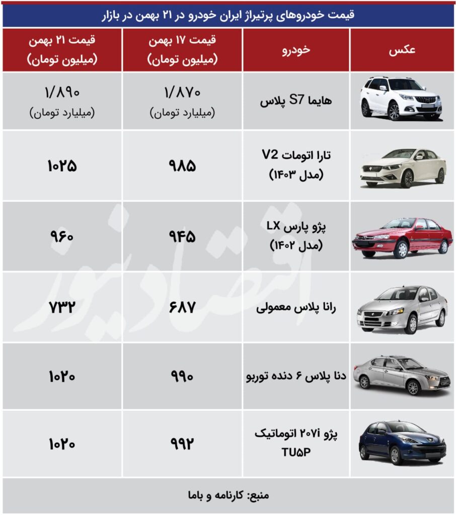 گزارش وب سایت Kardha و Bama نشان می دهد که در میان محصولات Khodro ایرانی امروز ، قیمت اتومبیل Dena Plus 6 توربوشارژ ، Peugeot I 207 Tu5p ، Hima S7 Plus ، Tara Automatic V2 ، Peugeot Pars LX Model 1402 و رانا پلاس مورد بررسی قرار گرفت.
