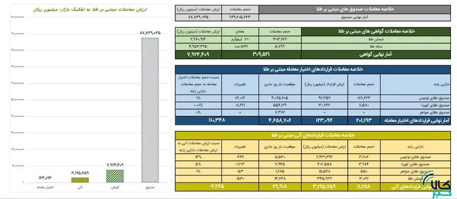 در قراردادهای مبتنی بر طلا ، 5000 قرارداد به ارزش 2 میلیارد دلار معامله شد. همچنین ، 2،800 قرارداد مبتنی بر طلا به ارزش 2 میلیارد تومانس نتیجه گرفت.
