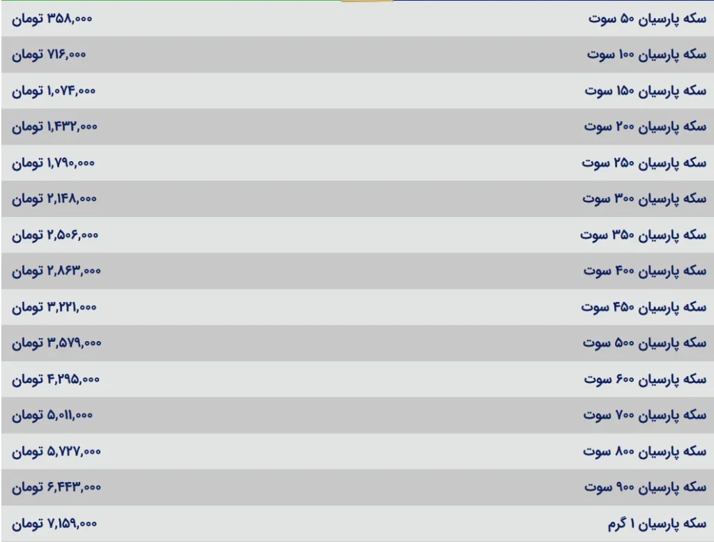 براساس Business News ، قیمت سکه پارس در روز یکشنبه 19 آوریل با هفت میلیون و 7 هزار تومانس در هر گرم بود. همچنین ، طبق انتخاب ، قیمت سکه فارسی در 4000 تومن ثبت شد.
