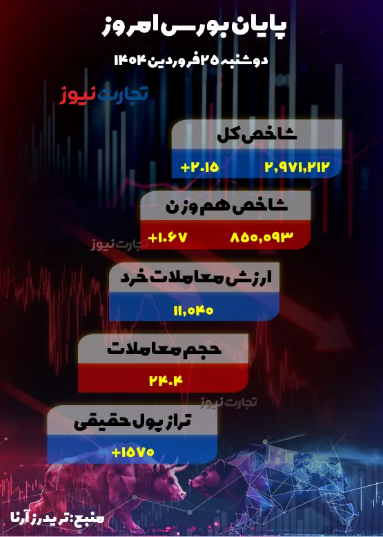 شایان ذکر است که بورس اوراق بهادار تهران حجم معاملات را با 24.4 میلیارد سهم و ارزش ریزگردها (سهام ، تقدم و صندوق های مشترک) 11،40 میلیارد تومن نشان می دهد.