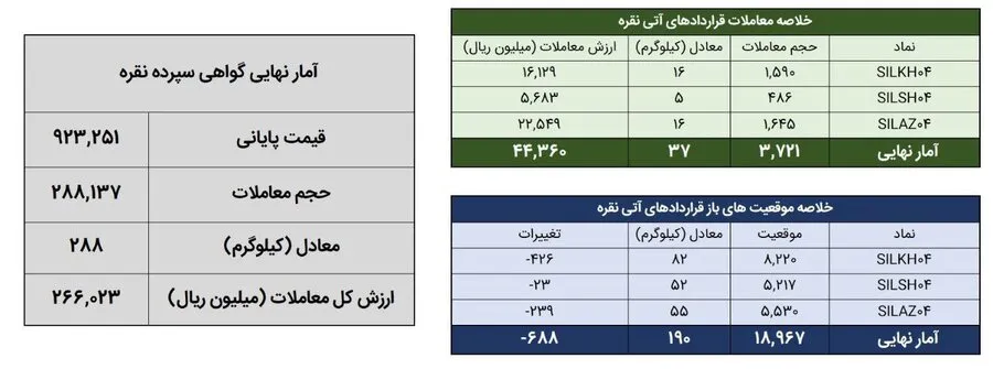 همچنین ، 2،800 قرارداد شمش نقره ای معادل 2 کیلوگرم شمش نقره ای به ارزش 1.5 میلیارد تومانس در بازار آینده نتیجه گرفت.