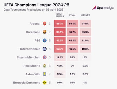 در بین تیم های باقیمانده ، اینتر میلان پس از پیروزی 1-1 مقابل بایرن مونیخ ، با شانس 1.5 ٪ در رده چهارم قرار دارد. بایرن که امیدوار است فینال در سالن بدنسازی Allianz Arena با احتمال 4.3 ٪ گزینه پنجم قهرمانی را در اختیار دارد. رئال مادرید همچنین با وجود شکست سنگین 2-0 در لندن ، از استون ویلا (4.3 ٪) و دورتموند (4.3 ٪) پیشی گرفت. دورتموند ، که بارسلونا را در خانه شکست داد ، در بین همه تیم ها کمترین فرصت را دارد و بازگشت آن در بازی بازگشت تقریباً غیرممکن است.