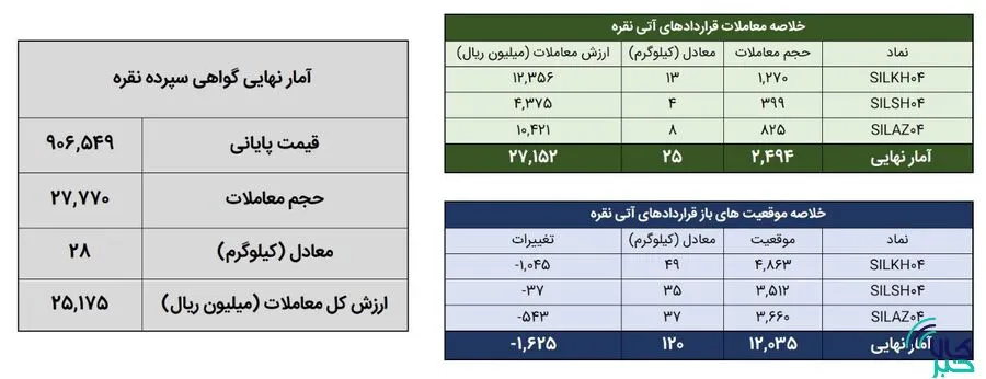 همچنین ، 2،800 قرارداد آتی معادل 1 کیلوگرم شمش نقره ای به ارزش 1.5 میلیارد تومانس نتیجه گرفت. در پایان آخرین روز معاملاتی ، موقعیت های افتتاح قراردادهای نقره نقره 5 کیلوگرم شمش نقره بود.