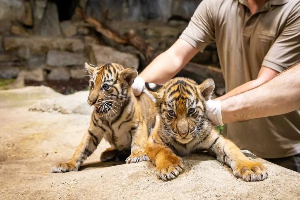 Twin Tigers ، Rasimi و Mandala ، روز جمعه در زمین خود در باغ وحش فرانکفورت گشت و گذار و کنجکاوی شدند. به گفته مدیر باغ وحش ، کریستینا گیگر ، اکنون خانواده ببرها بسیار خوب هستند. والدین مراقب هستند و توله سگها بی رحمانه و کنجکاو هستند ، وقتی خواب نیستند.