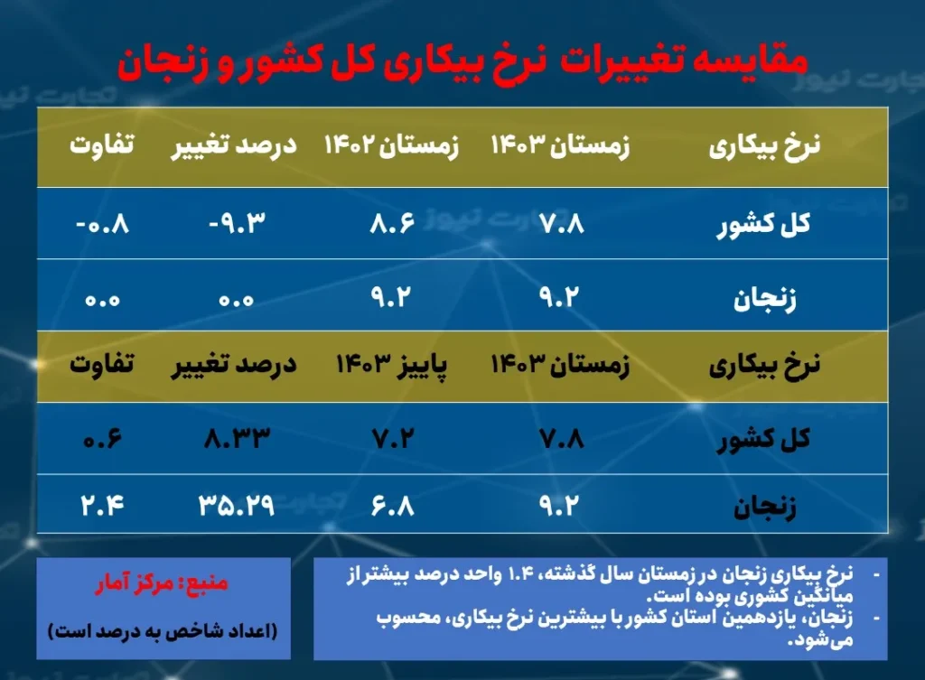 نرخ بیکاری زنجان در زمستان 1403 ؛ بالاتر از میانگین ملی
