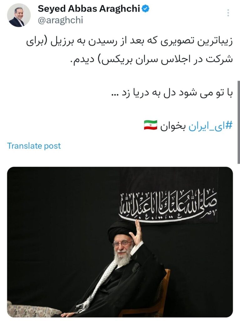 سید عباس اراكچی در پاسخ به حضور رهبر عالی انقلاب در شب اشورا از امام خمینی ، نوشت: “زیباترین تصویری كه بعد از رسیدن به برزیل دیدم (برای حضور در اجلاس بریکس).