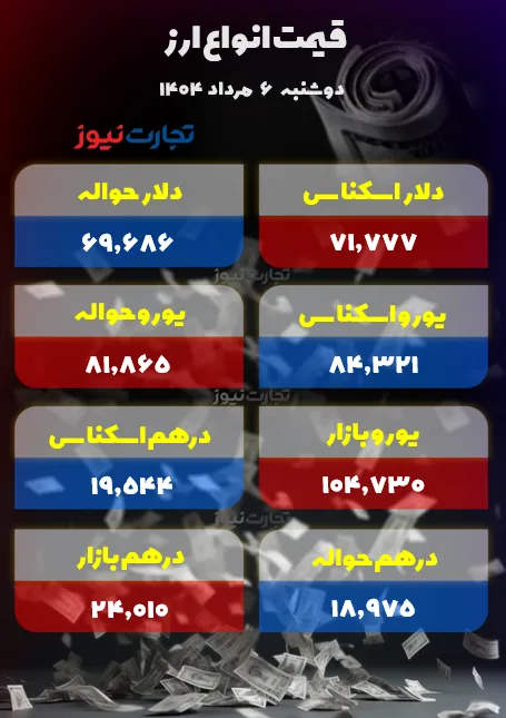 قیمت دلار در روز دوشنبه 6 اوت با 71،777 دلار اعلام شد. حواله دلار نیز در 69،686 دلار بود.
