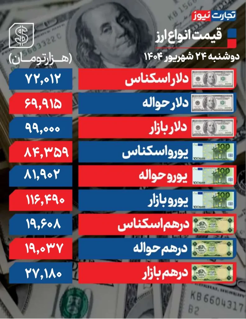 حواله دلار در مرکز مبادله روز دوشنبه 69.915 دلار بود. اسکناس دلار با 72200 دلار معامله شد.
