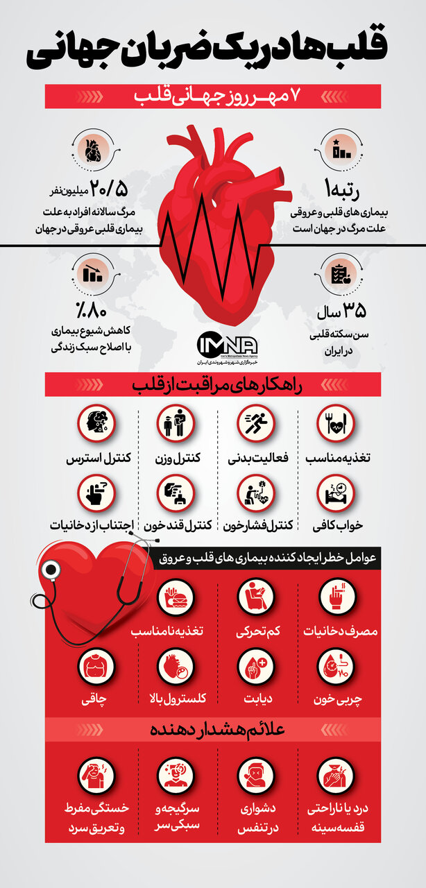 بیماری های قلبی عروقی هنوز هم در جهان در رده اول قرار دارد و بیش از 1.5 میلیون نفر در سال کشته می شود. طبق آمار ، سن انفارکتوس میوکارد در ایران به 5 سال رسیده است. یک رژیم غذایی سالم ، فعالیت بدنی ، کنترل فشار خون و قند خون و جلوگیری از استرس و دخانیات می تواند قلب سالم و زندگی طولانی تری داشته باشد.