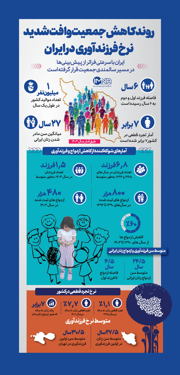 ایران در سال های اخیر با کاهش چشمگیر نرخ زاد و ولد و افزایش سن ازدواج مواجه بوده است. آمارها حاکی از آن است که فاصله تولد فرزند اول و دوم به حدود شش سال رسیده است و در کمتر از یک دهه میزان ازدواج بیش از 40 درصد کاهش یافته است. با ادامه روند فعلی کشور به سرعت وارد فاز سالمندی جمعیت خواهد شد.