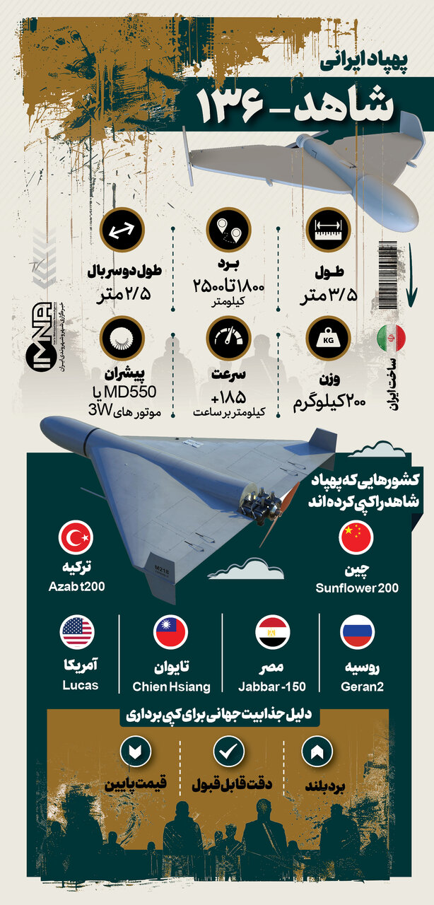 پهپاد انتحاری شهید 136 با برد پروازی 2500 کیلومتر، سرعت متوسط 185 کیلومتر در ساعت و توانایی حمل حدود 50 کیلوگرم مواد منفجره، به عنوان یک سلاح کاربردی مورد توجه بسیاری از کشورها مانند روسیه، آمریکا، چین و ترکیه قرار گرفته است. قیمت پایین، برد طولانی و دقت بالا از ویژگی های منحصر به فرد این پهپاد است.