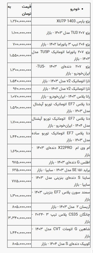 به گزارش اختاز نیوز به نقل از باشگاه خبرنگاران جوان، قیمت انواع خودرو در بازار آزاد امروز سه شنبه 9 دی ماه بر اساس معاملات انجام شده نسبت به آخرین معاملات روزهای گذشته در سایت های خرید و فروش خودرو به شرح زیر است: