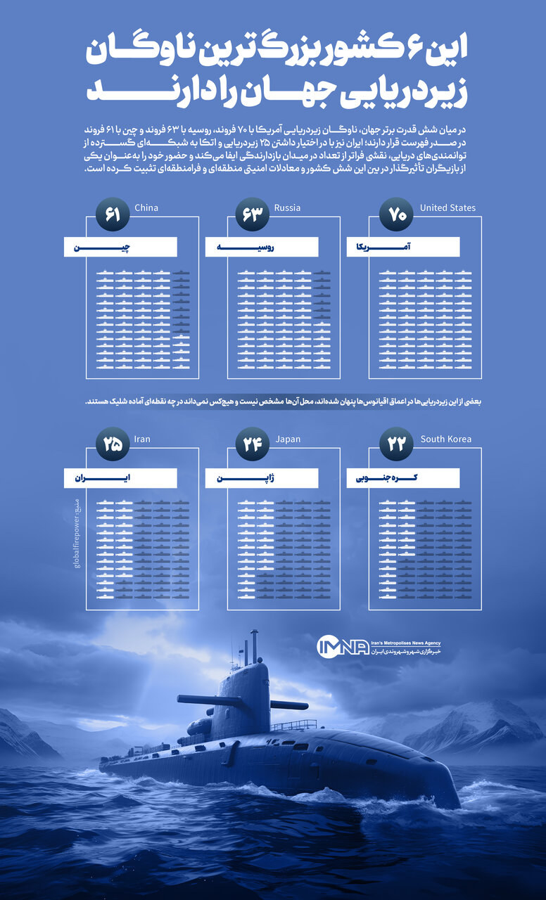 در میان رقابت قدرت های نظامی، زیردریایی ها به ستون فقرات بازدارندگی دریایی کشورها تبدیل شده اند. بررسی آمار ناوگان زیردریایی جهان نشان می دهد که 4 کشور آمریکا، روسیه، چین و ایران بیشترین تعداد زیردریایی عملیاتی را دارند. موضوعی که نقش تعیین کننده ای در امنیت منطقه و موازنه قوا دارد.
