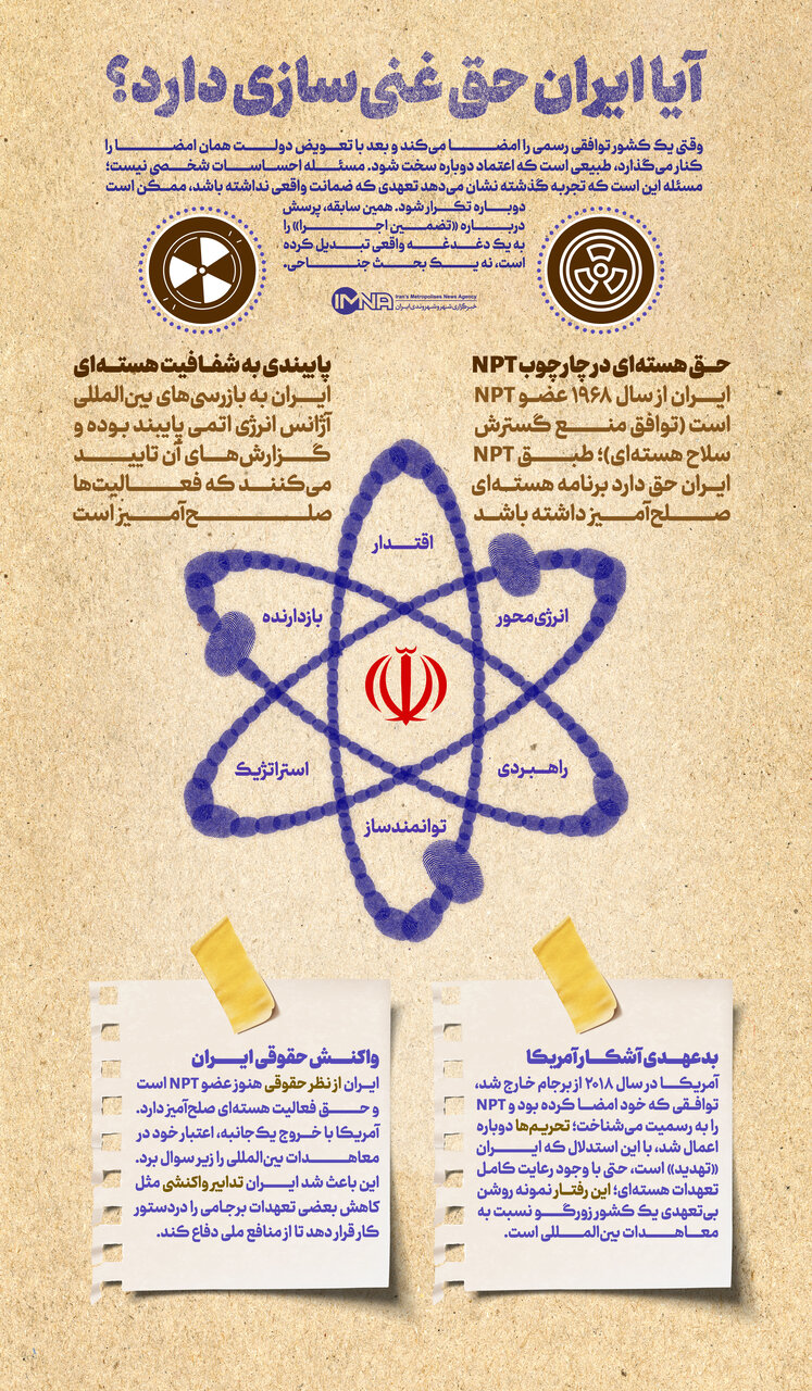 بر اساس NPT، ایران به عنوان یکی از اعضای رسمی این توافقنامه، حق استفاده صلح آمیز از انرژی هسته ای را دارد. گزارشهای آژانس انرژی اتمی نیز پایبندی ایران را تایید کرده و خروج آمریکا از برجام مشروعیت فشارها را زیر سوال میبرد.