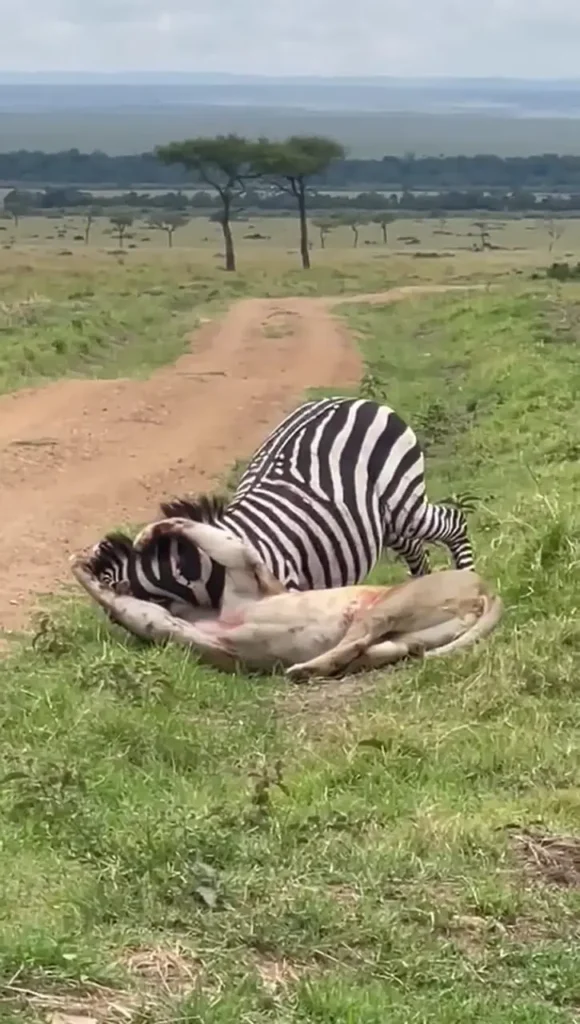 در یک صحنه حیرت انگیز از حیات وحش، یک گورخر با نشان دادن مقاومت و چابکی فوق العاده موفق شد از چنگ و چنگال یک شیر بگریزد و جانش را نجات دهد.