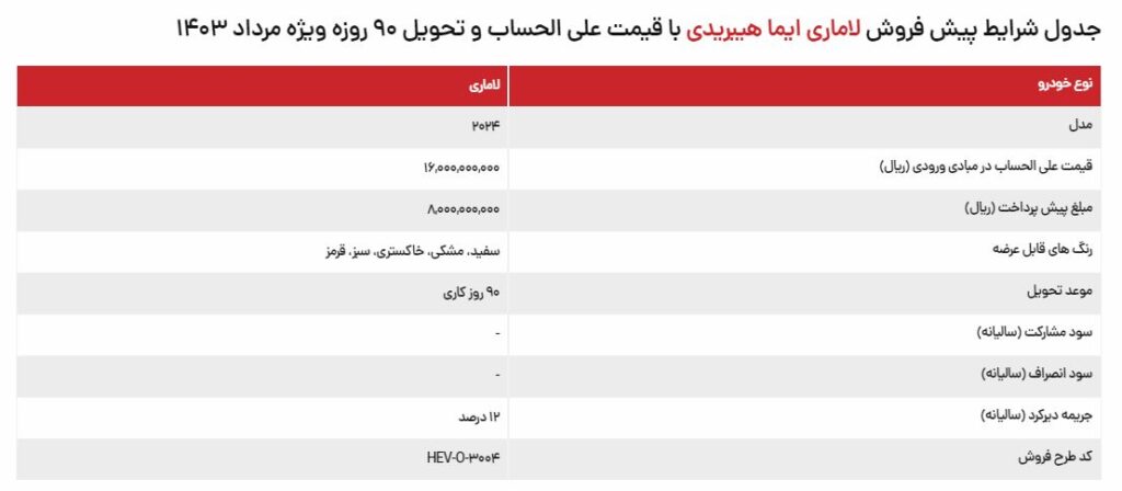 شرایط پیش فروش ویژه لاماری ایما هیبرید در مرداد ماه